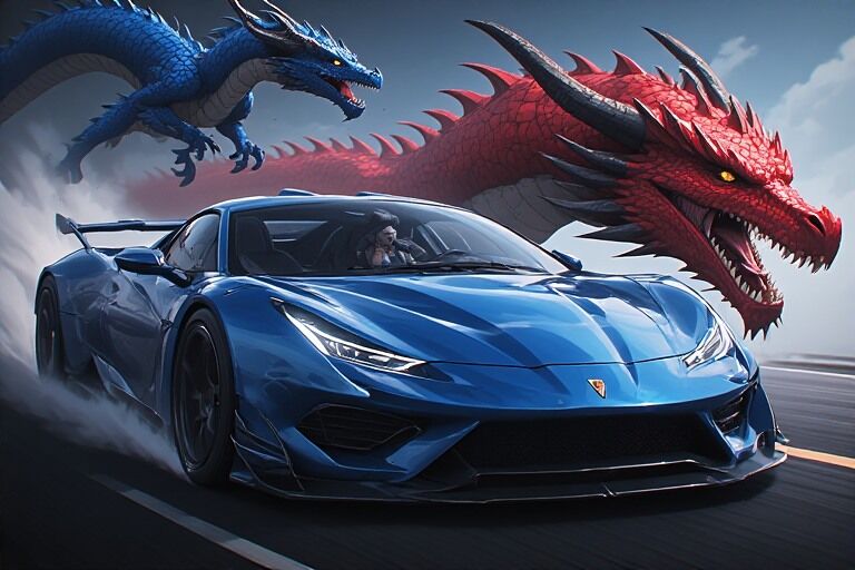 A blonde lady in silver wetlook leggings thought she was just taking her blue sports car for a spin. That is, until two dragons one red, one blue appeared, flanking her on the highway like mystical rivals.