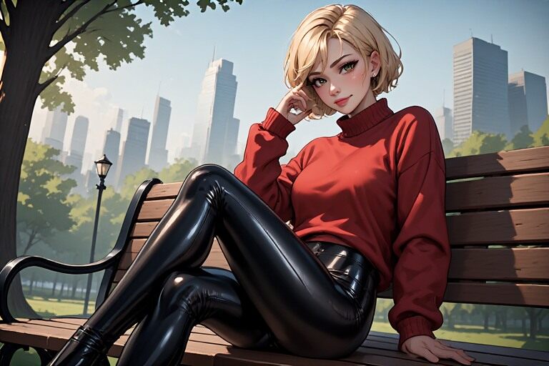 A short-haired blonde, a red long-sleeve sweater, and very shiny black wetlook leggings turn an ordinary park bench into a runway.