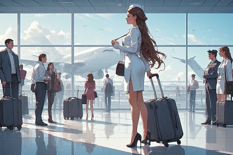 A tall lady in a crisp white flight attendant uniform walks through the airport with confidence, high heels clicking and luggage rolling behind her. Heads turn, phones come out, and suddenly the terminal feels like a fashion show in motion. Sometimes, all it takes is presence to stop an airport in its tracks.