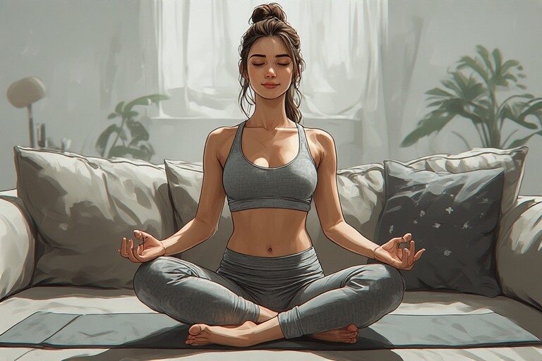 Yo turns her sofa into the ultimate holiday yoga studio. In her gray yoga outfit and matching bonnet, she flows from planks to knee bends, finishes in a calming Indian seat, and winks at the camera all while warm lights and twinkling Christmas decorations create the perfect cozy vibe.